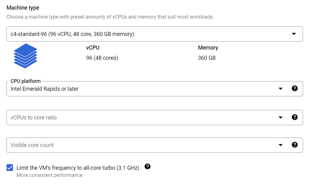 Machine configurationtab and specifyMachine typeasc4-standard-96. You can also setCPU platformand turn on all-core turbo to make performance more stable: